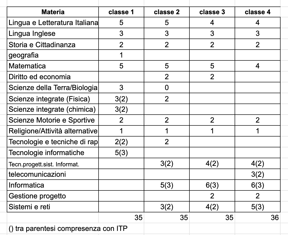 La disciplina diritto ed economia sarà posticipata alle classi 2 e 3 per consentire approfondimenti al diritto del lavoro per fornire agli studenti strumenti per maggiore consapevolezza sui temi della contrattualistica.Il corso prevede integrazioni interdisciplinari tra informatica, sistemi e reti, matematica, diritto ed economia e gestione progetto, per permettere agli studenti di comprendere la trasformazione digitale non solo come fenomeno tecnico, ma come processo organizzativo, economico e sociale che impatta profondamente sulle imprese e sulle comunità.